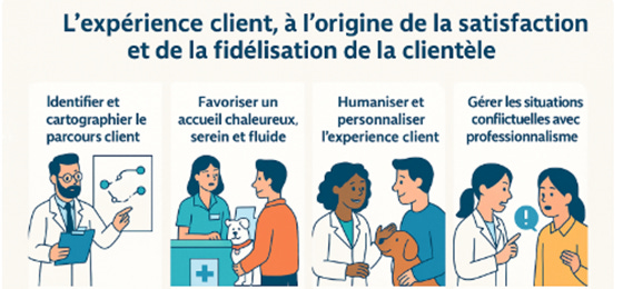 L'expérience client se poursuit au sein de la clinique vétérinaire, lors des interactions avec les différents membres de l’équipe vétérinaire, que ce soit à l’accueil, dans la salle d’attente, en salle de consultation, et ensuite à distance après la visite.